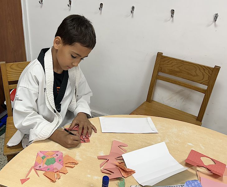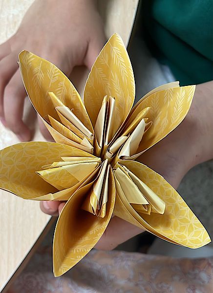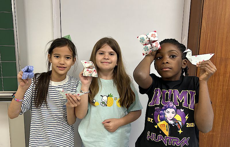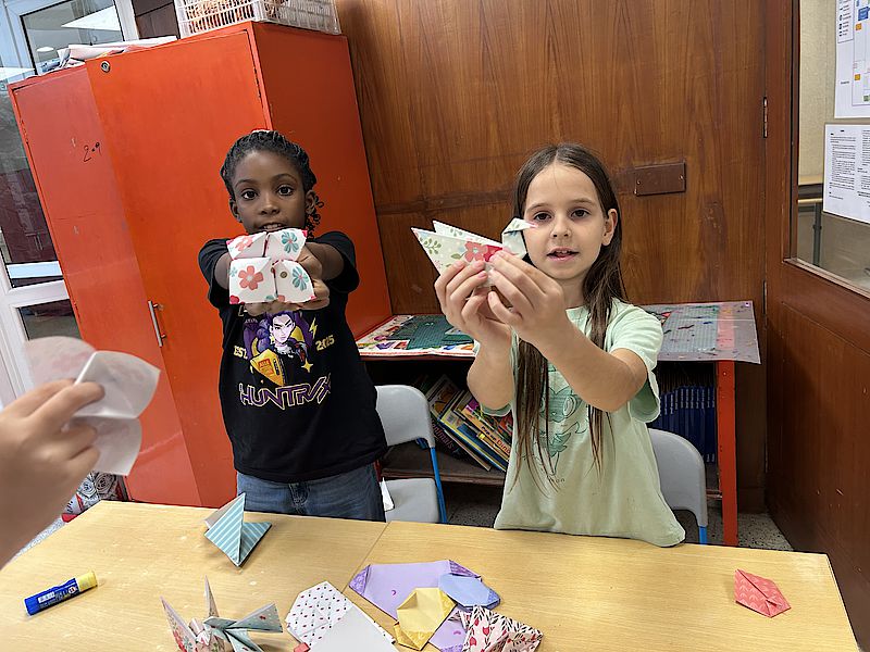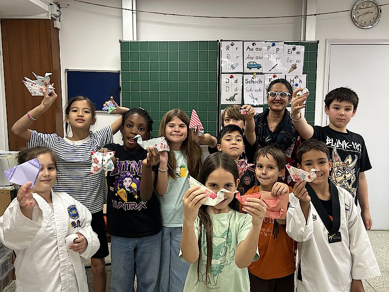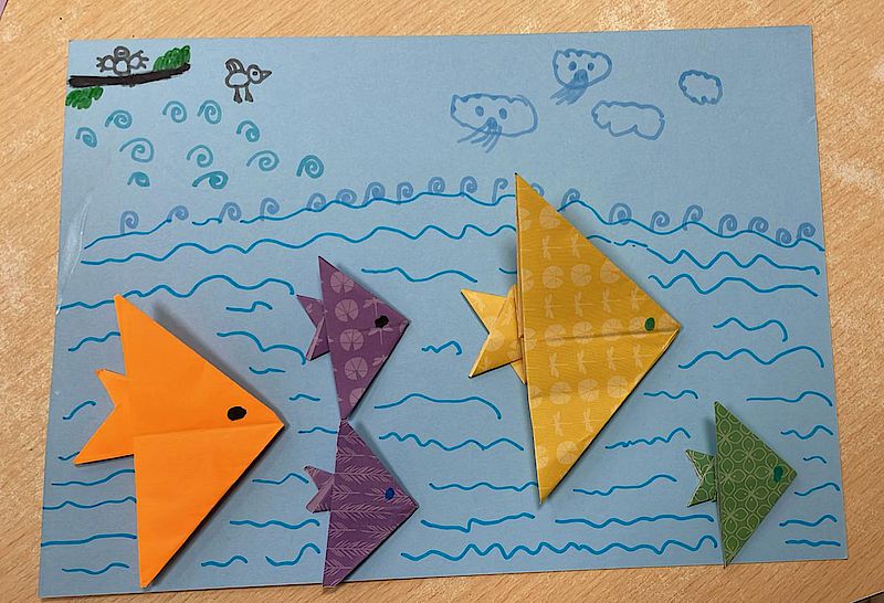 In unseren Sitzungen erwecken wir Origami zum Leben und gestalten Werke, mit denen sich die Kinder wirklich identifizieren können – begonnen haben wir mit einem charmanten Origami-Lesezeichen für unsere bücherliebende Gruppe. Mit großer Begeisterung experimentieren sie mit verschiedenen Papiergrößen, Farben und Mustern und erschaffen dabei von der Natur inspirierte Arbeiten, von Unterwasserwelten und Gartenlandschaften bis hin zu Vögeln, Pandas, Hunden, Katzen und sogar 3D-Würfeln.