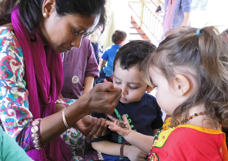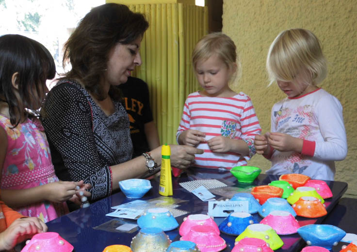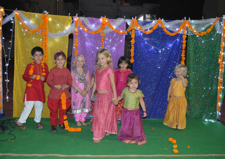 Im Rahmen des Themas „ Begegnung mit dem Gastland“, fand die nun schon traditionelle „ India Week“ als Kindergarten übergreifende Projektwoche statt. In diesem Jahr stand besonders das Diwalifest und alles was zu den Vorbereitungen gehört im Zentrum der Aktivitäten. Die Kinder fertigten viele verschiedene Lichter und Dekorationen an, die bei der großen Diwali Mela zum Verkauf angeboten wurden. Hier wurden auch bei einer Auktion drei sehr schöne Kunstwerke der Kinder versteigert. Der Erlös geht an Organisationen, die unterprivilegierten Kindern helfen. Tanz, Puppenspiel, Indische Kleidung, indische Geschichten, indisches Essen, und der Besuch von verschiedenen Märkten auf denen indisches Kunsthandwerk angeboten wird standen ebenfalls auf dem Programm. Alles in Allem ein reiches Programm welches unseren Kindern ihr Gastland näher gebracht hat. Wir möchten an dieser Stelle noch einmal ganz herzlich unserem Elternbeirat danken, der uns wie in jedem Jahr wieder unterstützt hat.