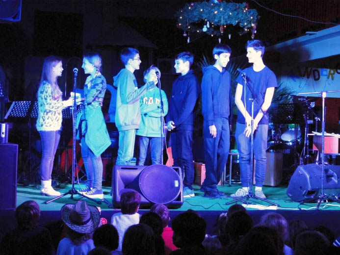 Das Singen stand im Vordergrund, Chöre und Klassen überzeugten mit alten und neuen Weihnachtsklassikern, die Band zeigte ihr Können und rockte die „Stars“ vom Himmel, aber auch verspielte Tanzpräsentationen der Grundschüler erfreuten das Publikum. Es war ein gelungener Abend, der mit Würstchen und Glühwein bzw. Kinderpunsch für den notwendigen Rahmen sorgte, auf den sich alle freuten: Weihnachten und natürlich Ferien.