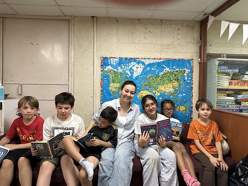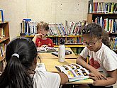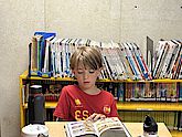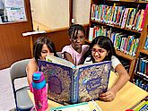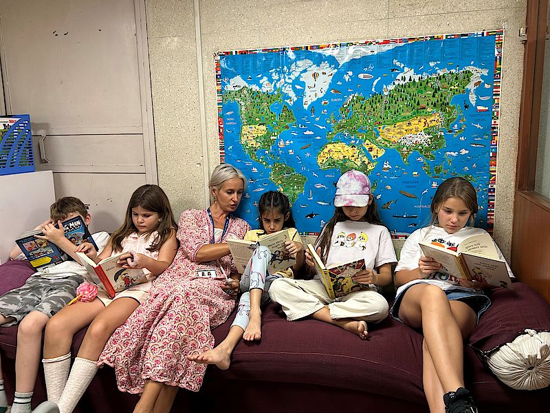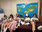 The reading pirates feel right at home in the small elementary school library. As soon as everyone has found a place on the sofa, they're ready to go!