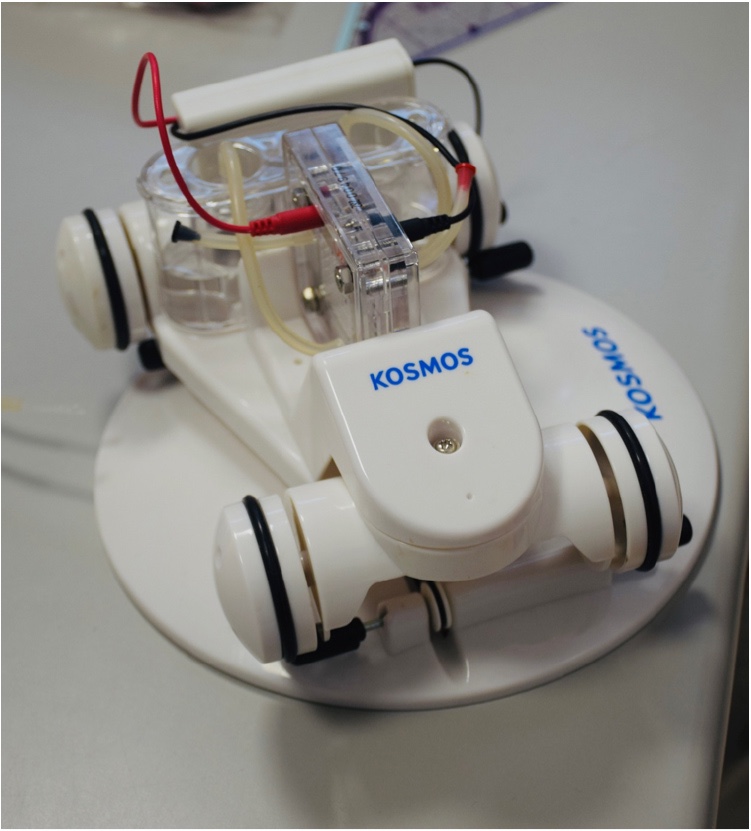 Acht Schülerinnen und Schüler der DSND stellten sich dieser thematischen Herausforderung und machten sich mit den tatsächlichen Möglichkeiten dieses Gases vertraut. Bau und Betrieb einer Brennstoffzelle stand zunächst theoretisch auf dem Plan. Ein größerer Spaß war aber, das Modellauto aus dem Kosmos-Experimentierkasten tatsächlich damit auch fahren zu lassen. Noch schöner war, dass wir unsere kleines Wasserstoff-Auto wirklich draußen in der Sonne aufladen konnten, um mit dem gewonnenen Wasserstoff dann drinnen fahren zu können.