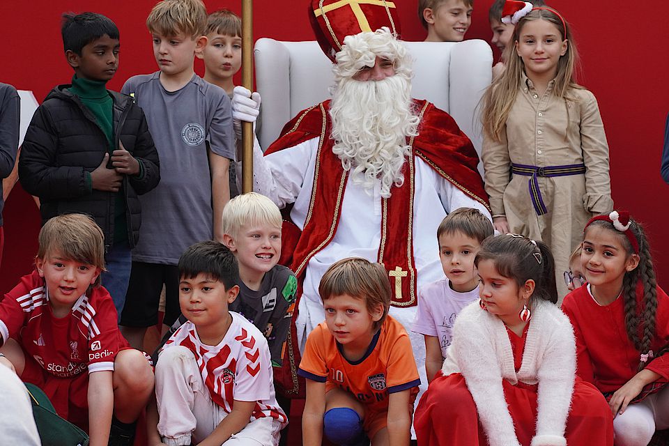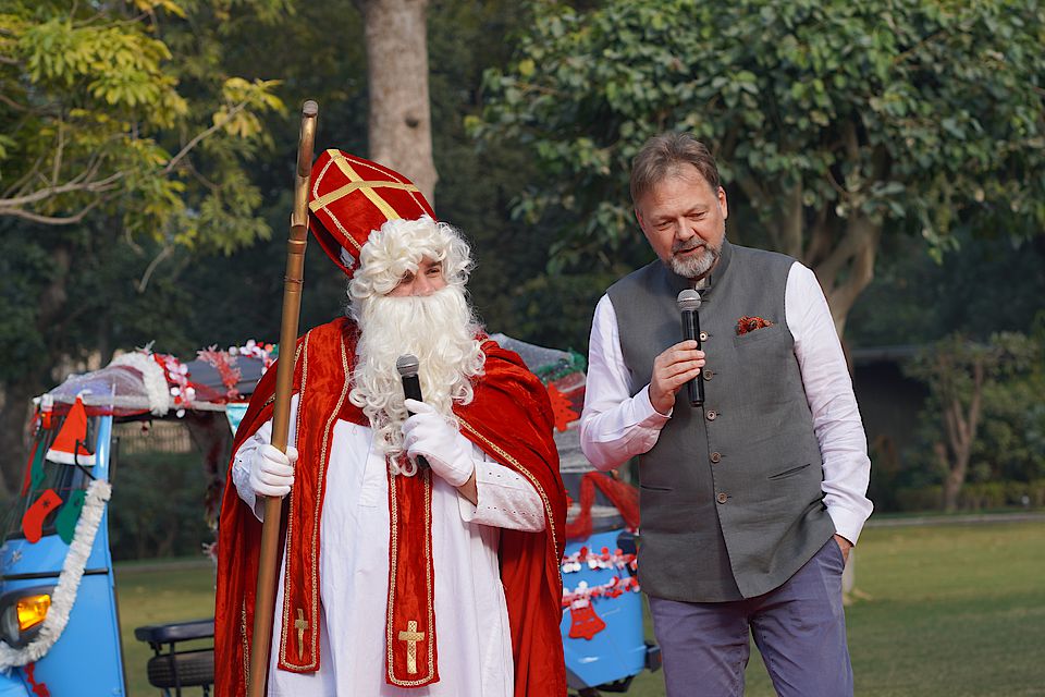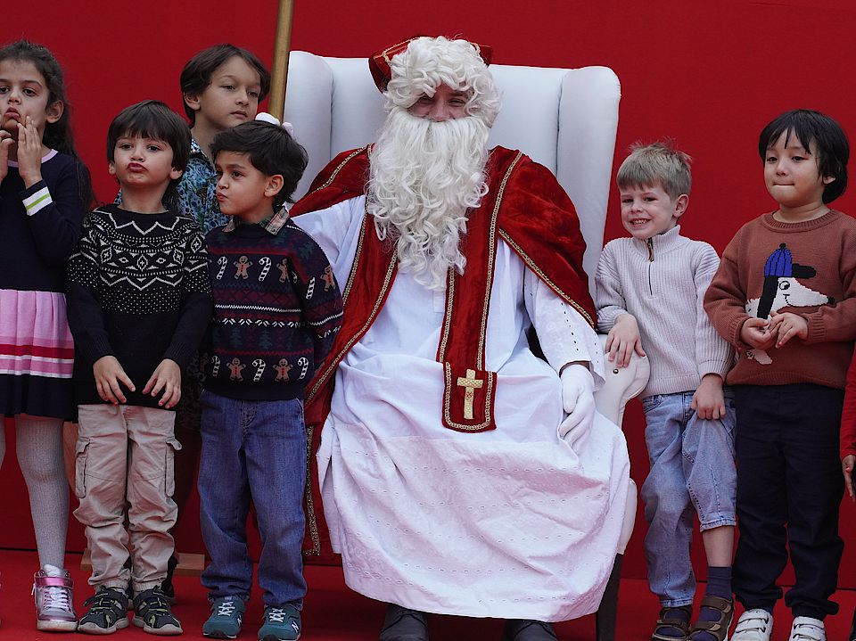 Das Nikolausfest rückte immer näher, und die Kinder aus dem Kindergarten und der Grundschule hatten schon viele Wochen fleißig für den Besuch des Nikolaus geübt. Endlich war es so weit: Am 7. Dezember schien die Sonne, und der Botschaftsgarten war wunderschön geschmückt. Überall liefen fröhliche Kinder voller Vorfreude herum.