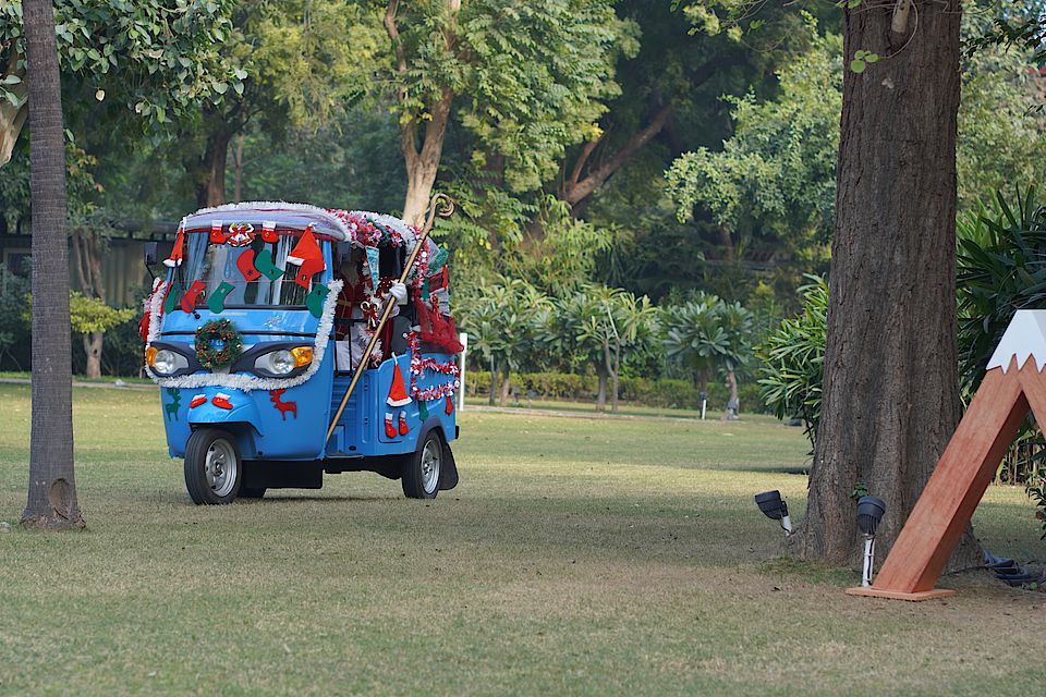 Plötzlich hörten sie aus der Ferne ein Schnurren und Summen. Sofort liefen die Kinder dem Geräusch entgegen. Und tatsächlich – es war der Nikolaus! Und er kam in einer weihnachtlich geschmückten Autorikscha angefahren! Die Kinder jubelten und freuten sich riesig.