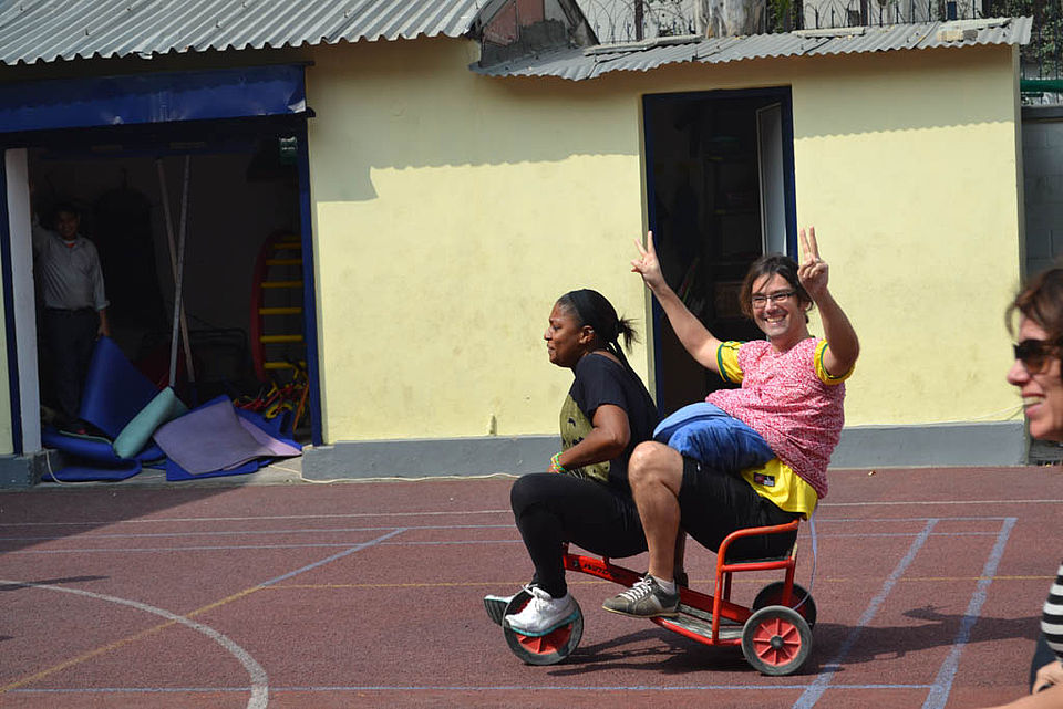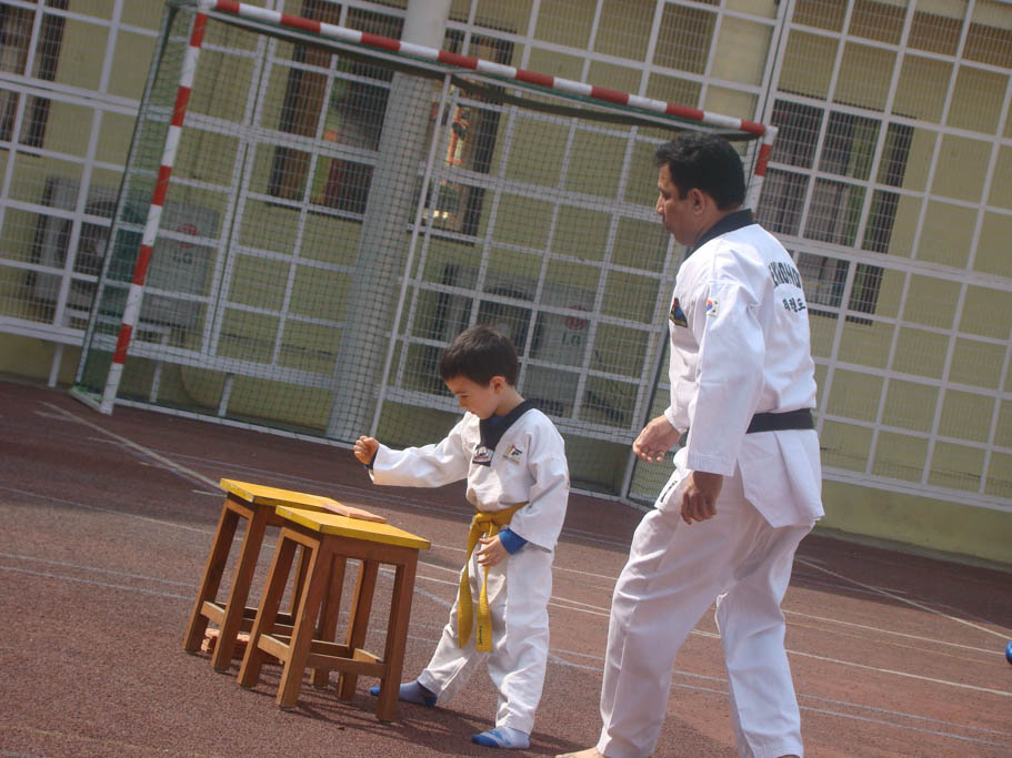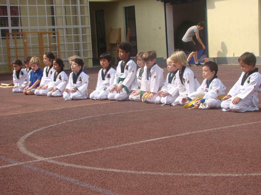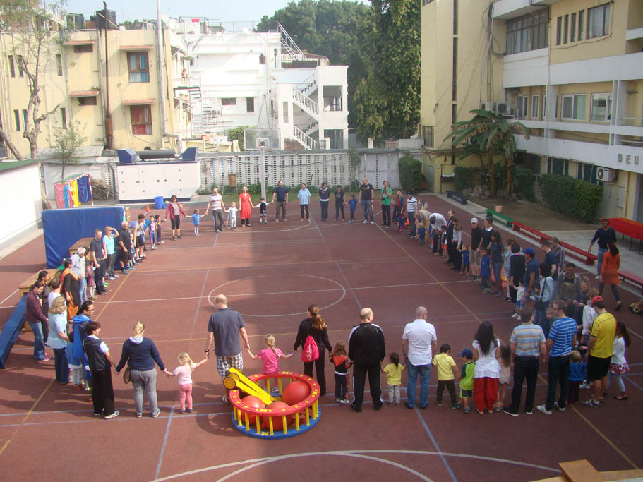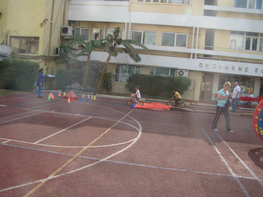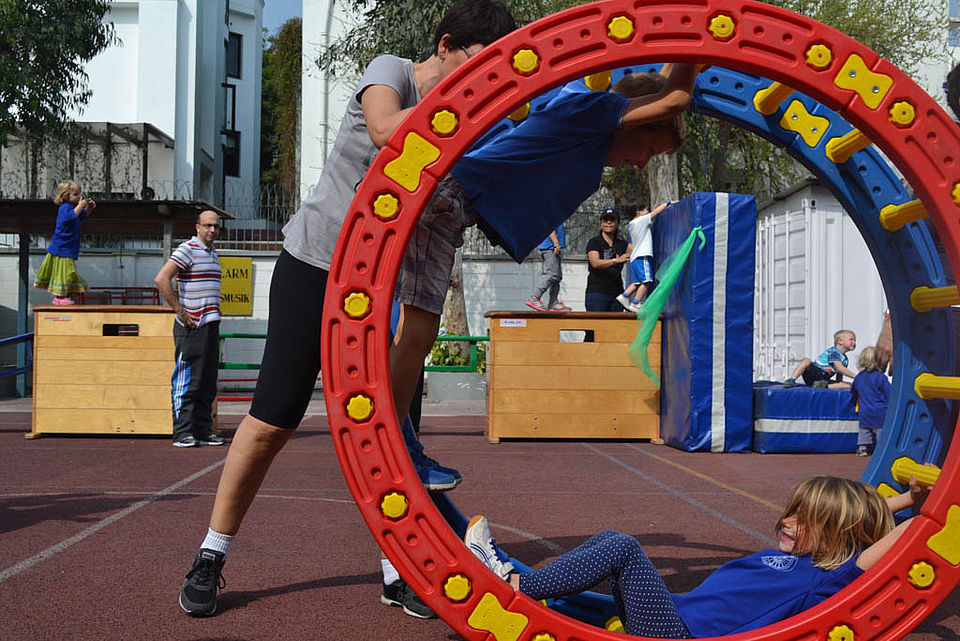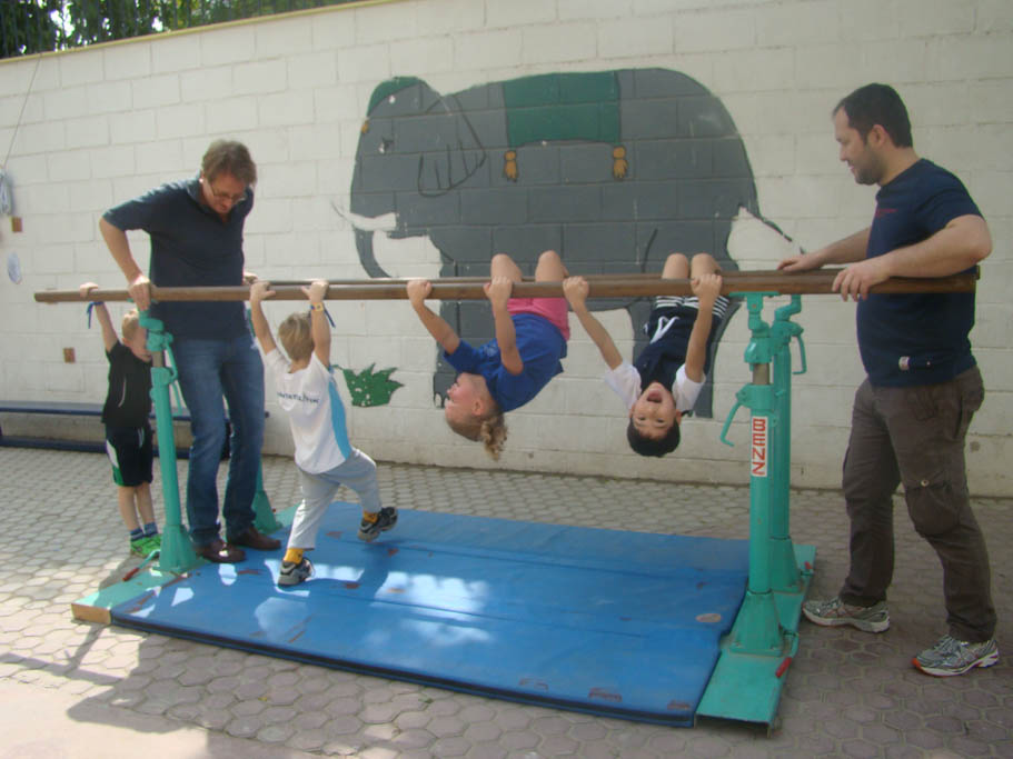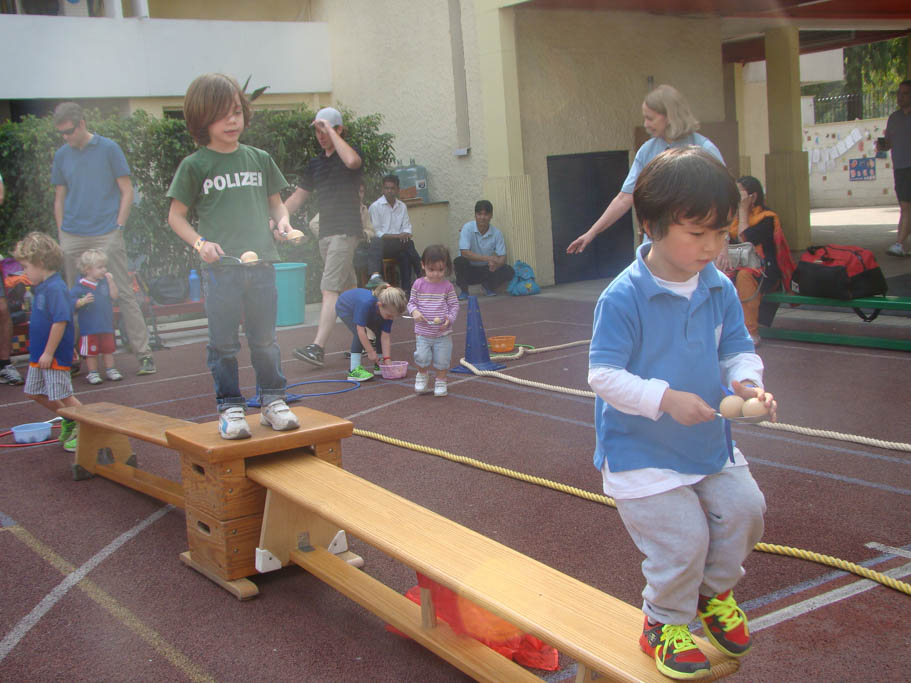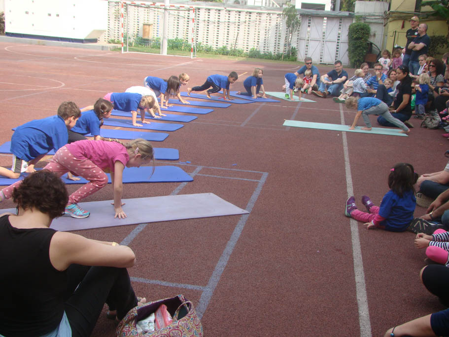 Es ging los mit einer Aufwärmrunde, um die müden Knochen und Gelenke zu aktivieren. Danach gab es Stationen Sport. Jeder konnte alles ausprobieren. Balancieren, Laufen , ein Fahrrad Parcours, hoch hinauf klettern und runterspringen, werfen und rollen mit den unterschiedlichsten Bällen, ein Eierlauf mit Hindernissen,“ Pedalo“, Stelzen, Hüpfbälle und sogar das Rhönrad standen zur Verfügung. Da war für jeden etwas dabei. Danach ging es mit Vorführungen der Yogagruppe und der Taekwondo Gruppe weiter. Anschließend gab es viel Spaß bei lustigen Wettspielen für Eltern und Kinder. Und zum Schluss konnten Jung und Alt dann bei dem Mittagsbuffet noch ganz gemütlich beisammen sitzen, essen schwatzen und das Fest ausklingen lassen.